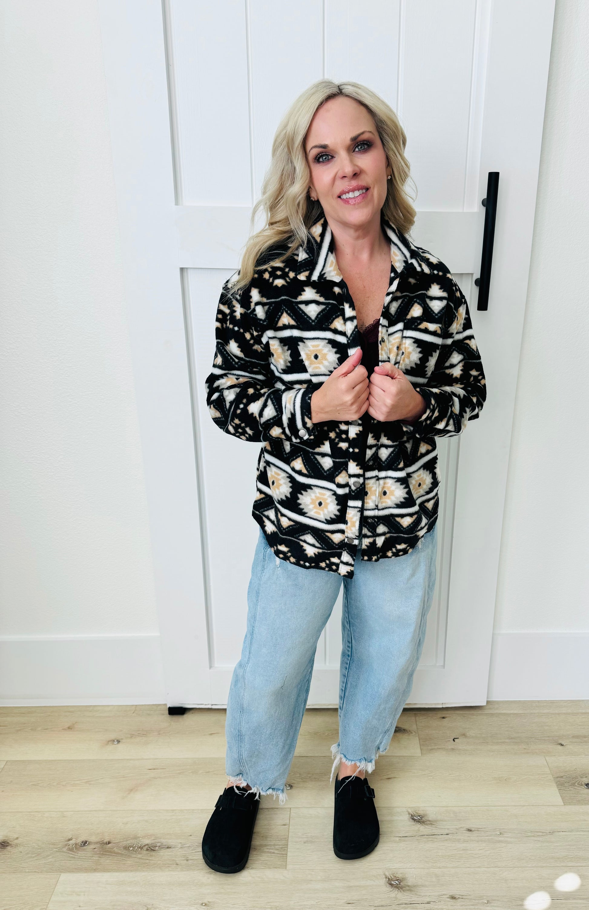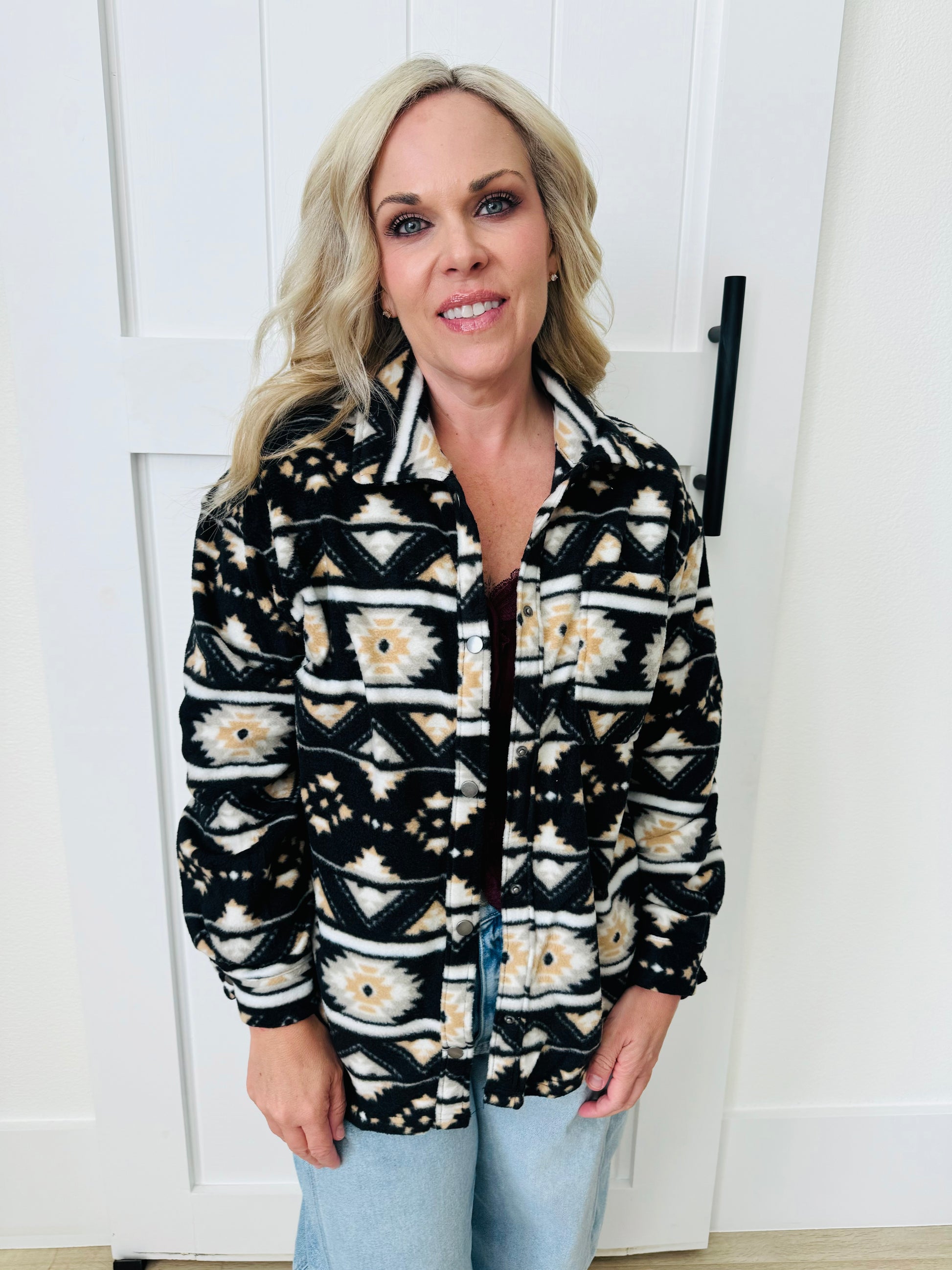 LONG SLEEVE PRINTED FLEECE SHACKET. BUTTON DOWN. COLOR IS BLACK AND CAMEL. Model is wearing size small.