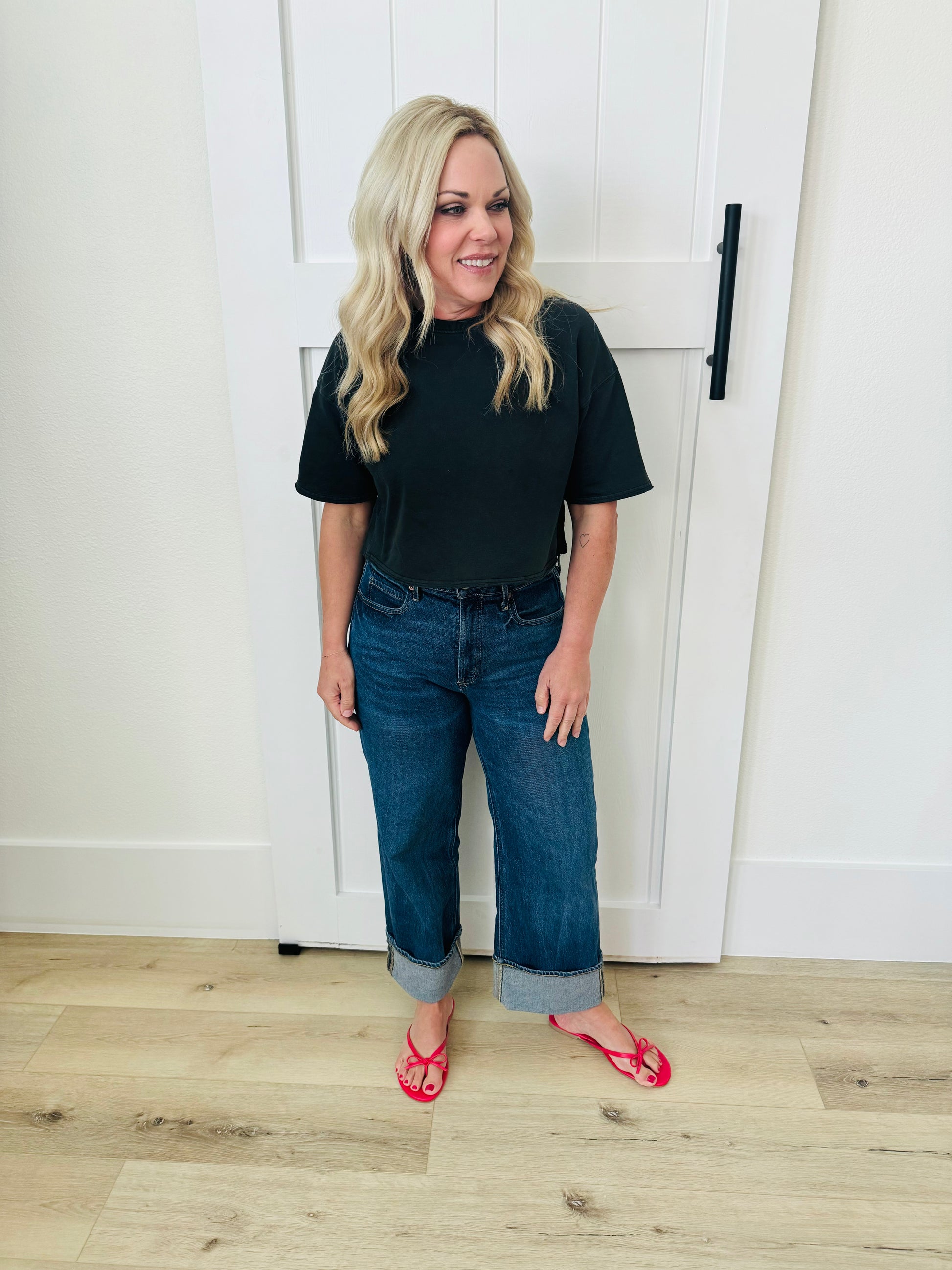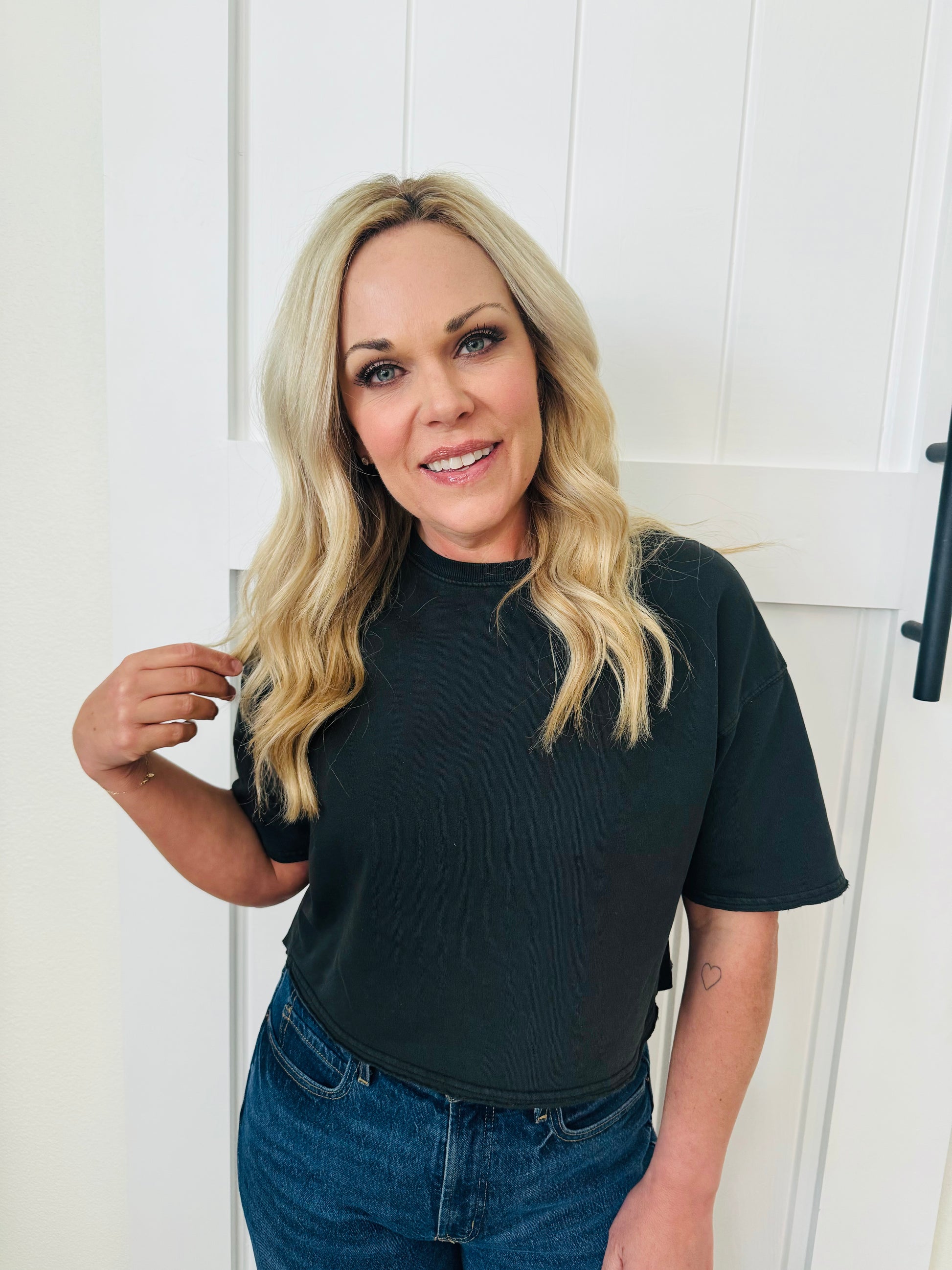 Your Casual Coffee Run Starts With This Basic Tee. Crafted From Lightweight Fabric, This Tee Has A Crew Neckline, Short Sleeves And A Boxy Fit. The Cropped Raw Cut Hem Is Best Paired With High-Rise Denim Shorts. Color is black. Model is wearing a size medium.