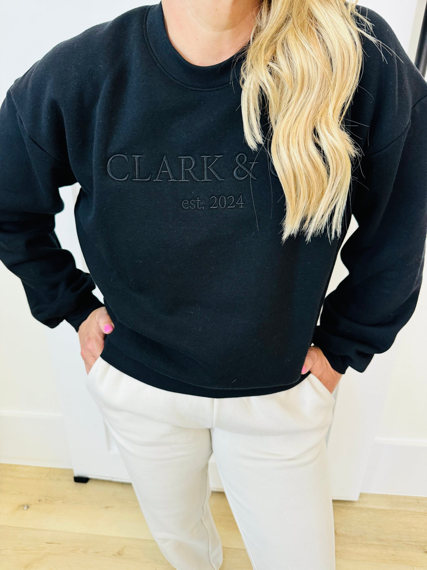 Basic Lightweight crew neck sweatshirt. Embroidered with Clark & Co. Color is black. Model is wearing a size large.