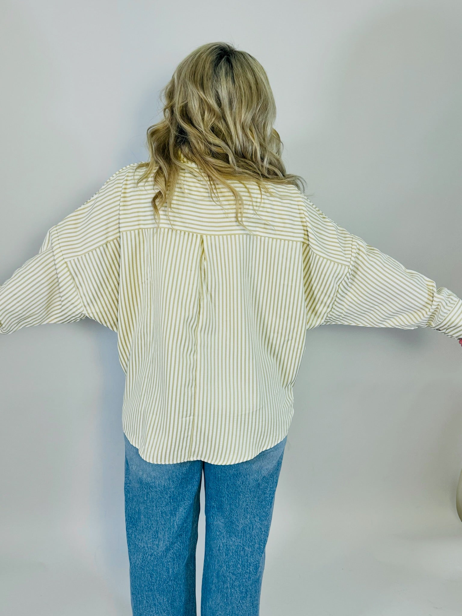 A relaxed fit striped shirt featuring a button-up front, drop shoulders, and classic collar. Pair with denim cutoffs for a laid-back, chic style. Color is taupe and white. Model is wearing a small.