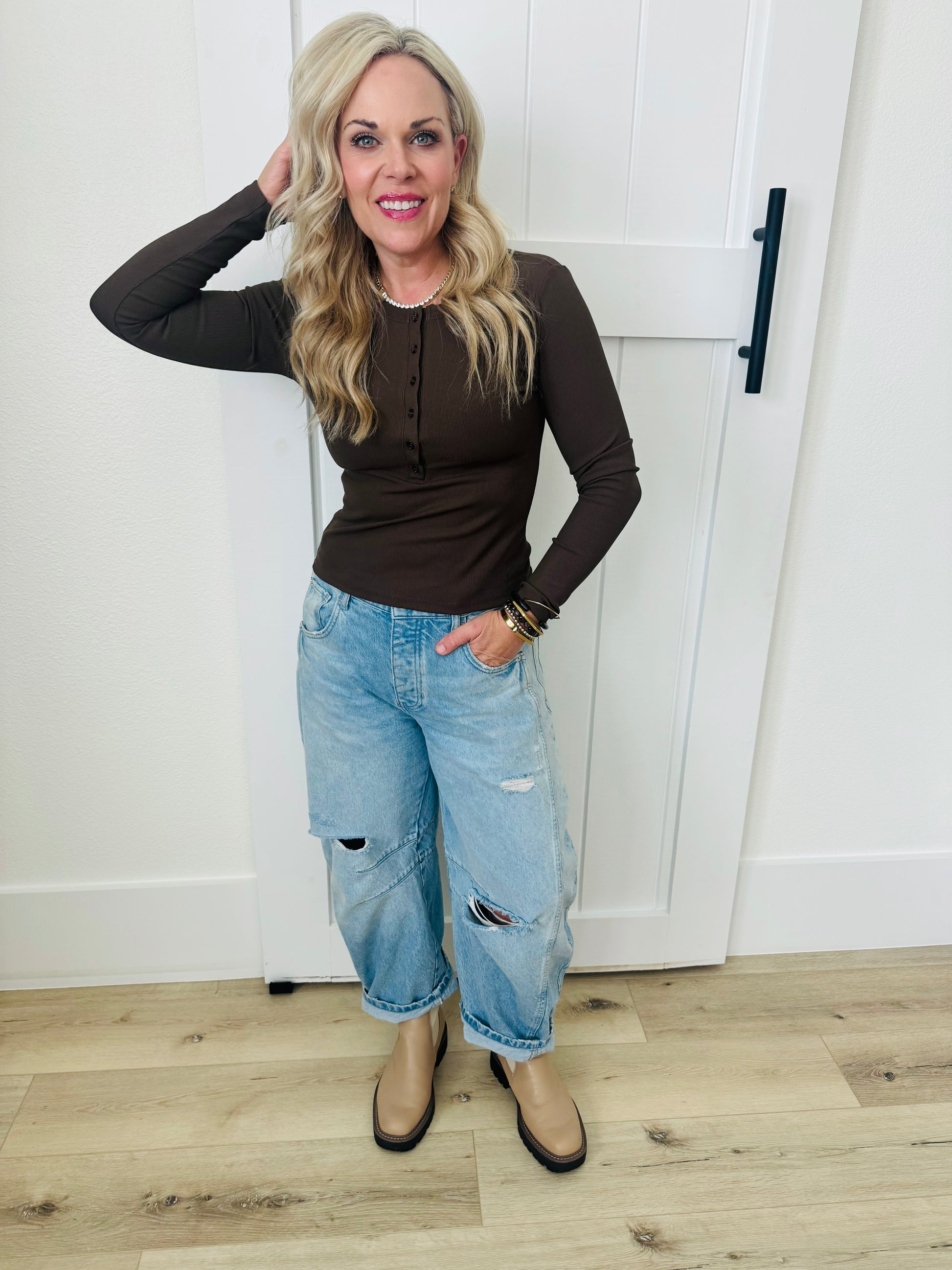 A classic knit top with a ribbed texture, long sleeves, and a buttoned henley neckline—your go-to for casual comfort and timeless style. Color is chocolate brown. Model is wearing a size large.