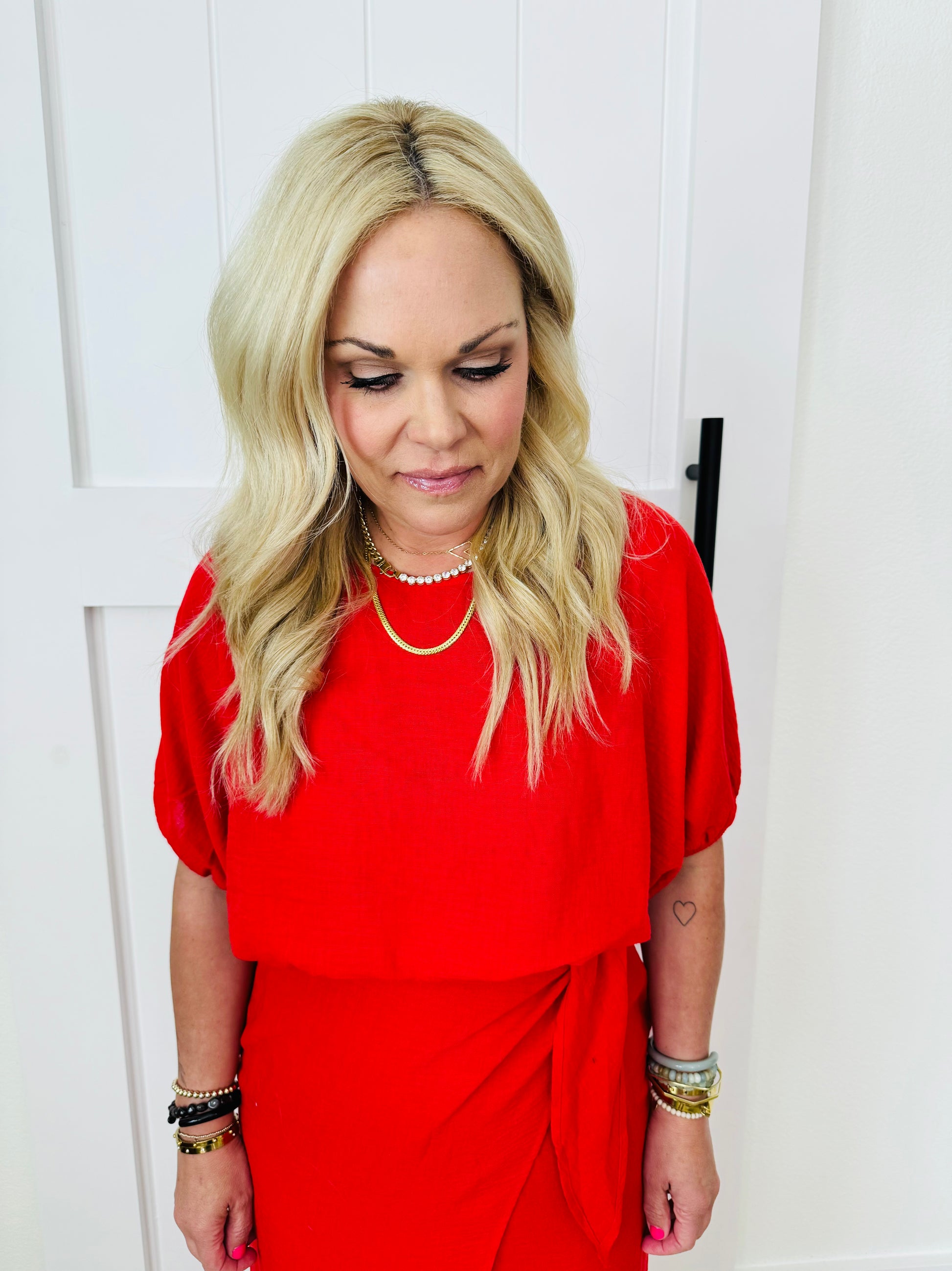 Stay In Style, Thanks To This Cropped Top. Made From Crinkle Woven Fabric, This Top Features A Boat Neckline And Short, Puff Sleeves With Elasticized Hems. The Blouse Ends In A Cropped Hem With Elasticized Detailing That Cinches In The Fit. Color is red. Model is wearing a size large.