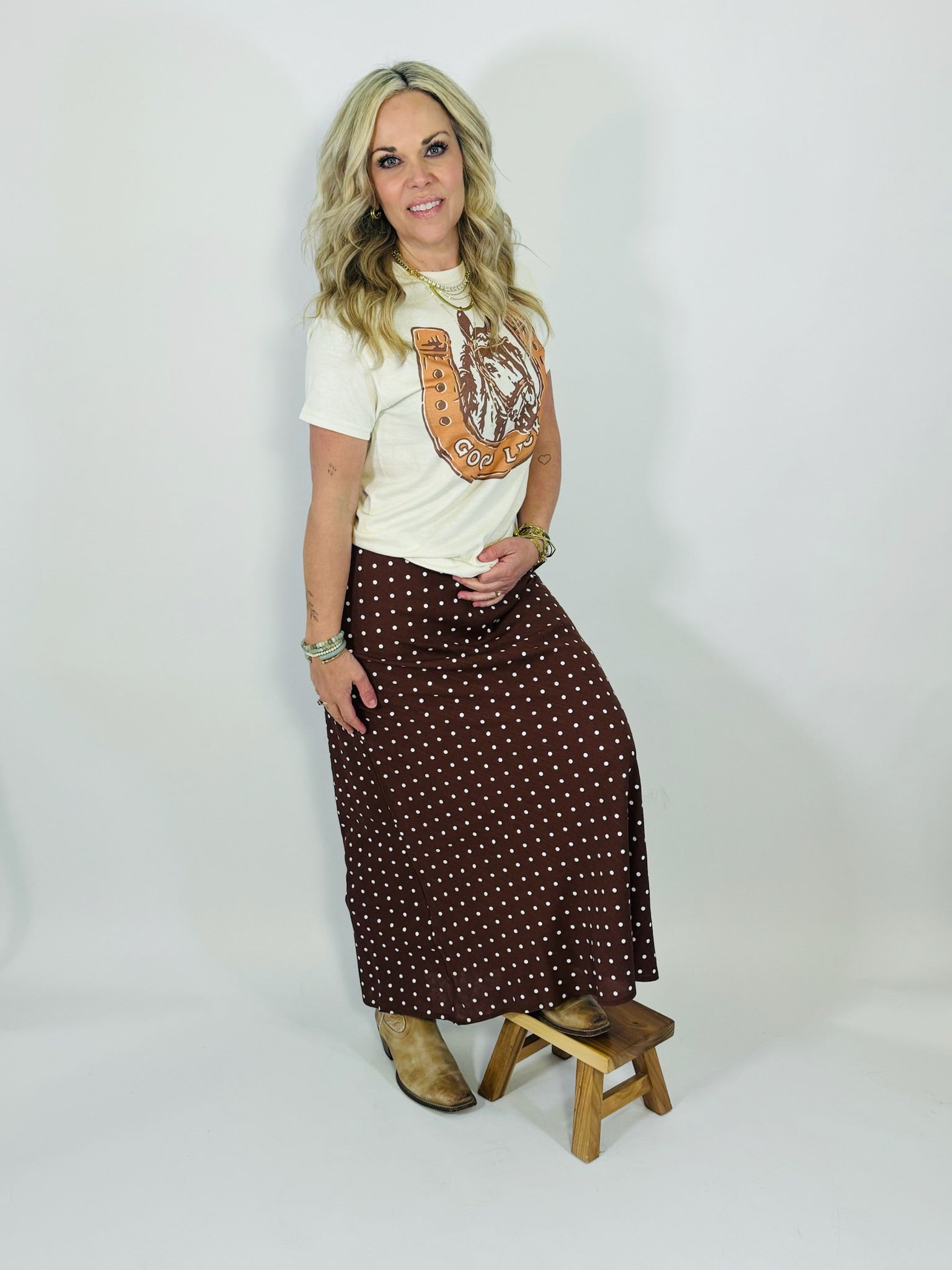 A comfy graphic tee featuring a bold horseshoe and horse design with “Good Luck” lettering. Soft, easy to wear, and in unisex sizing for that perfect relaxed fit. Model is wearing a size small.