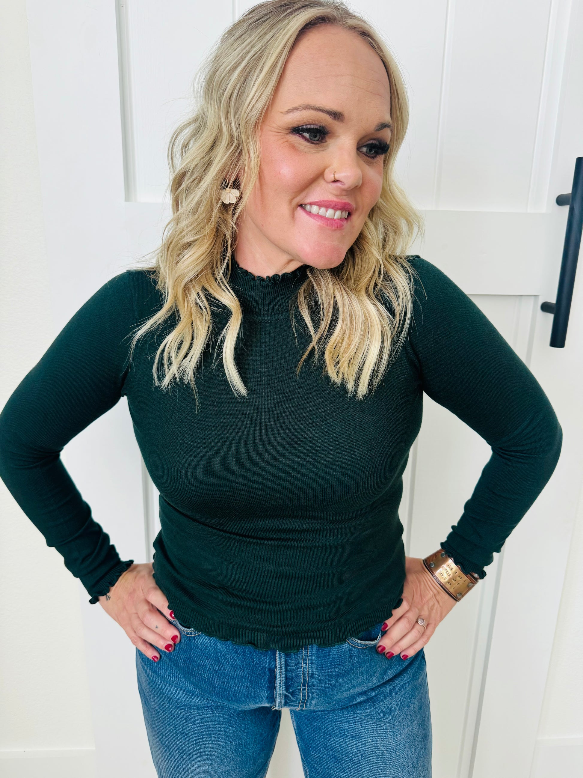 A sleek solid knit pullover featuring a mock neckline, delicate lettuce trim, and long sleeves for that effortlessly polished yet cozy look. Color is hunter green. Model is wearing a large.