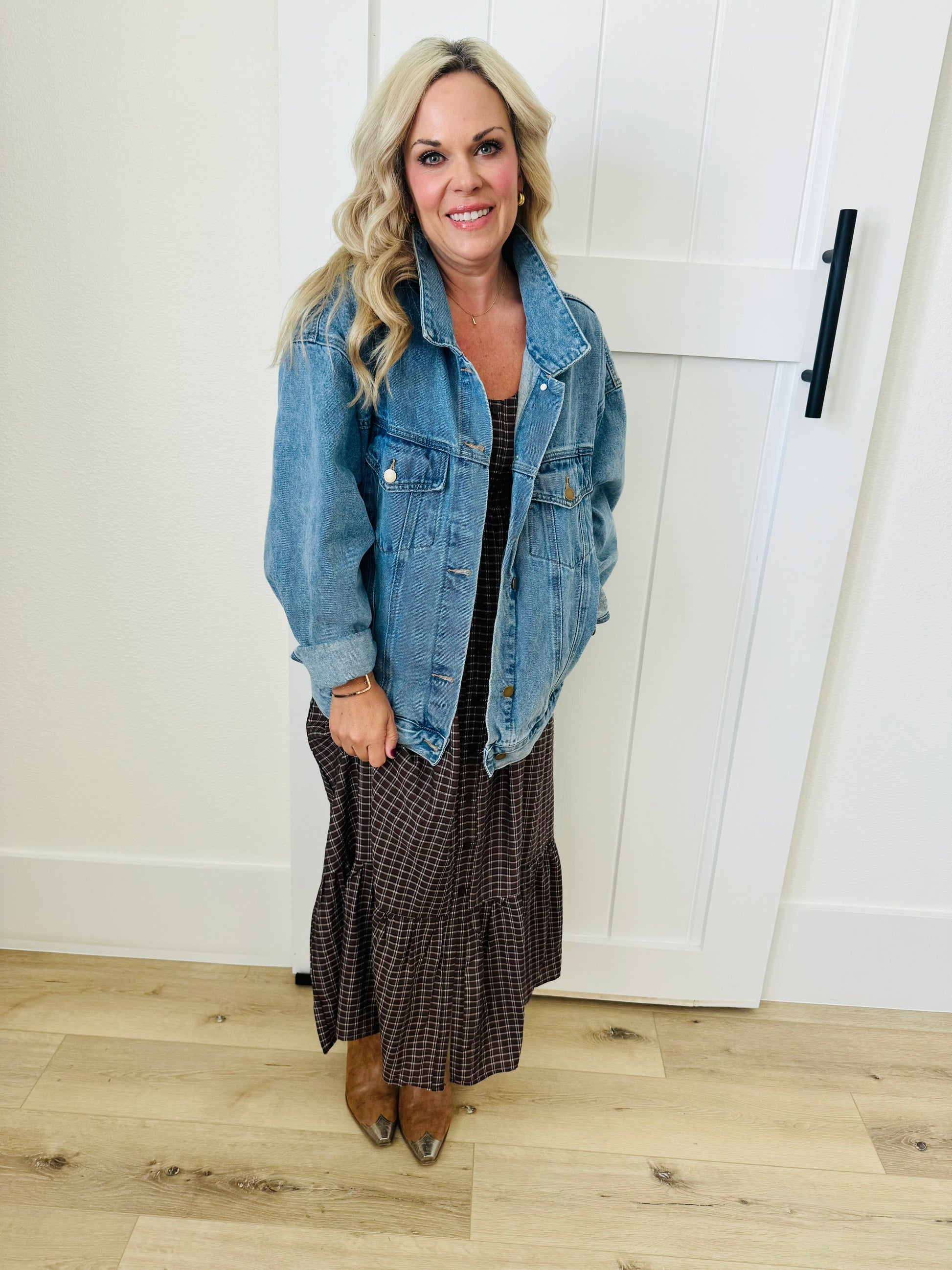 The boxy silhouette of this denim jacket gives off relaxed vibes - perfect to layer over your activewear for a casual outing or a night out. It features two breast pockets, two side pockets, and metal buttons. Model is wearing a size small.