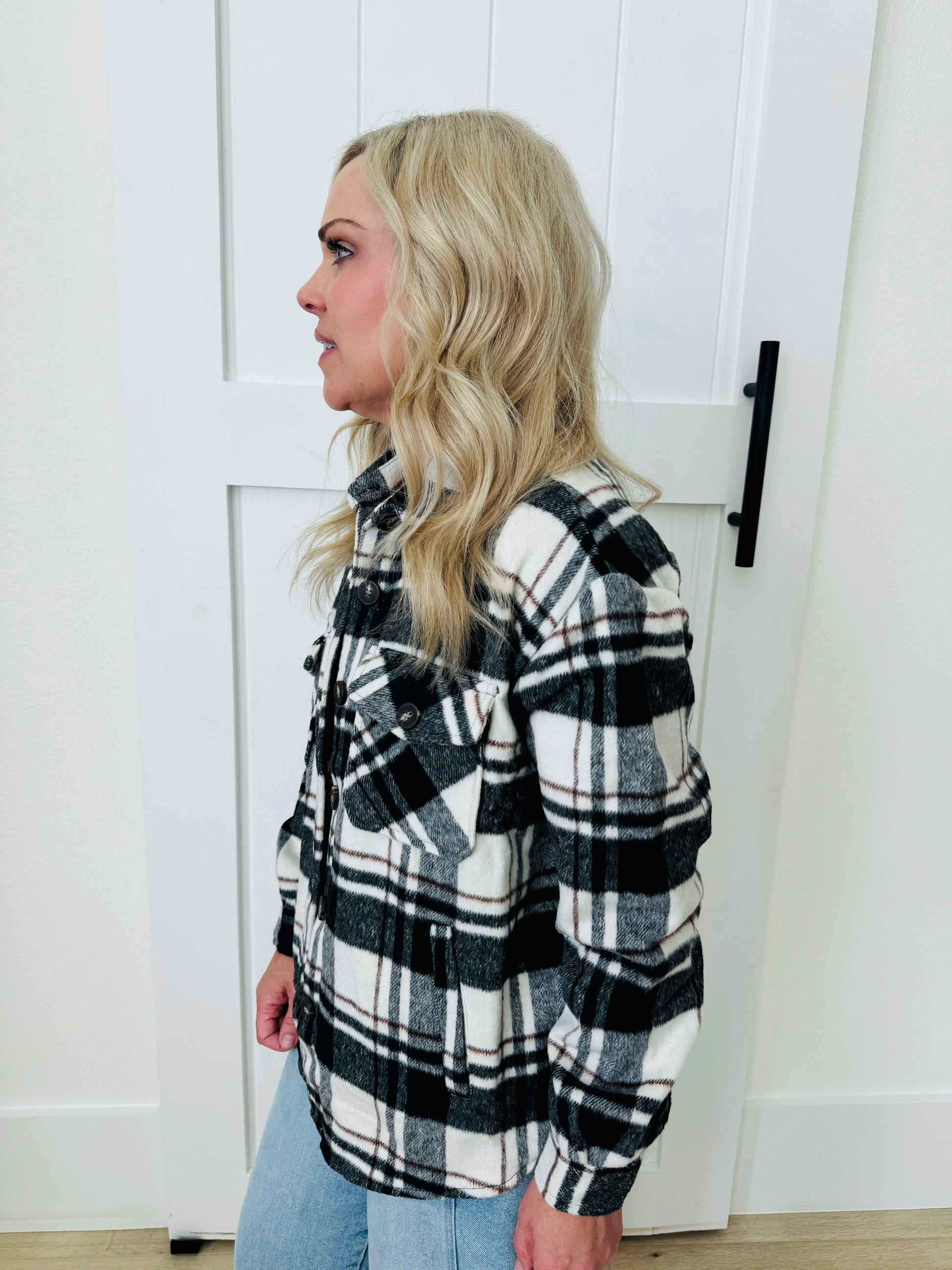 LONG SLEEVE WOOL BLEND PLAID BUTTON DOWN CASUAL JACKET. Color is black and white plaid. Model is wearing a size small.