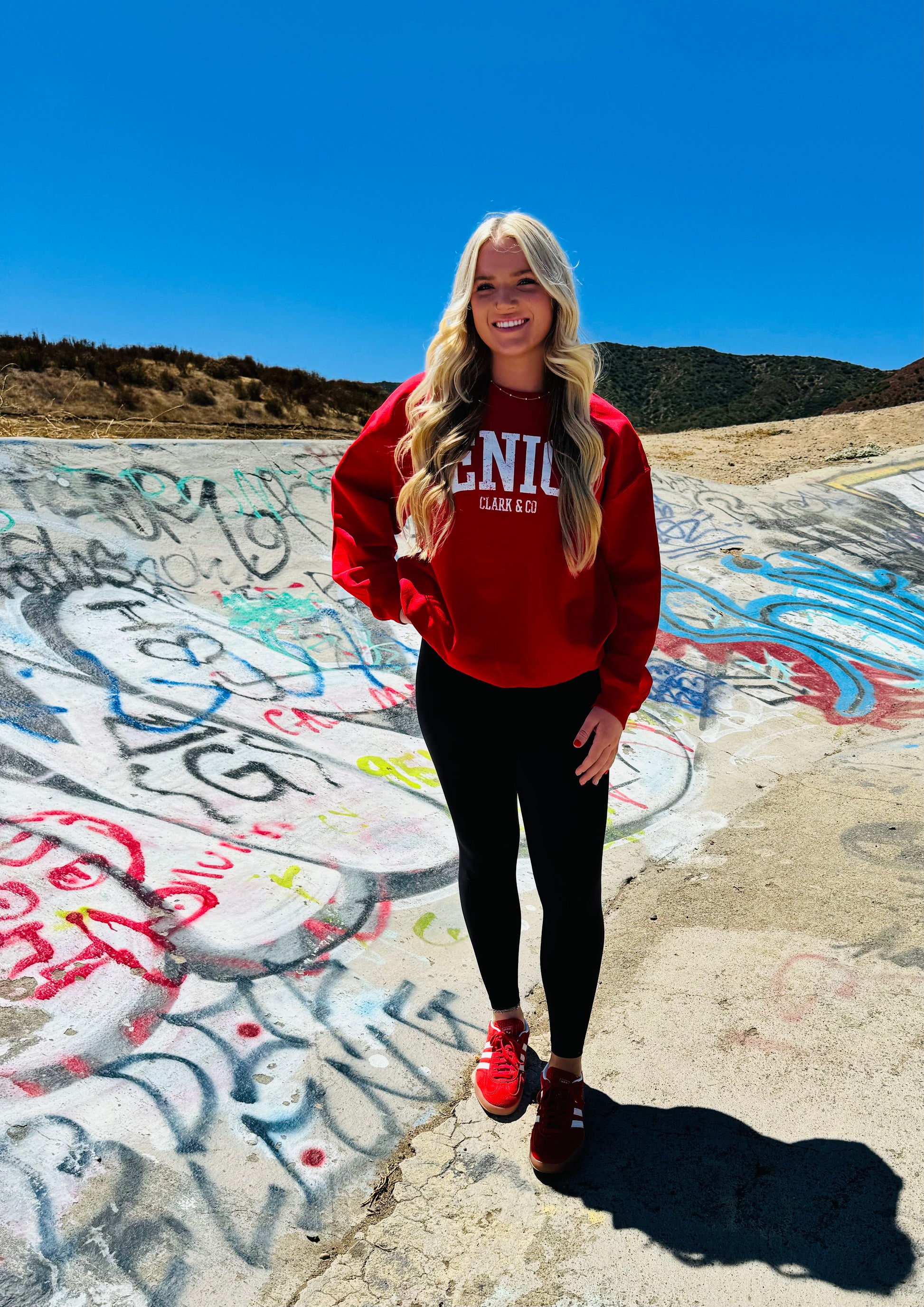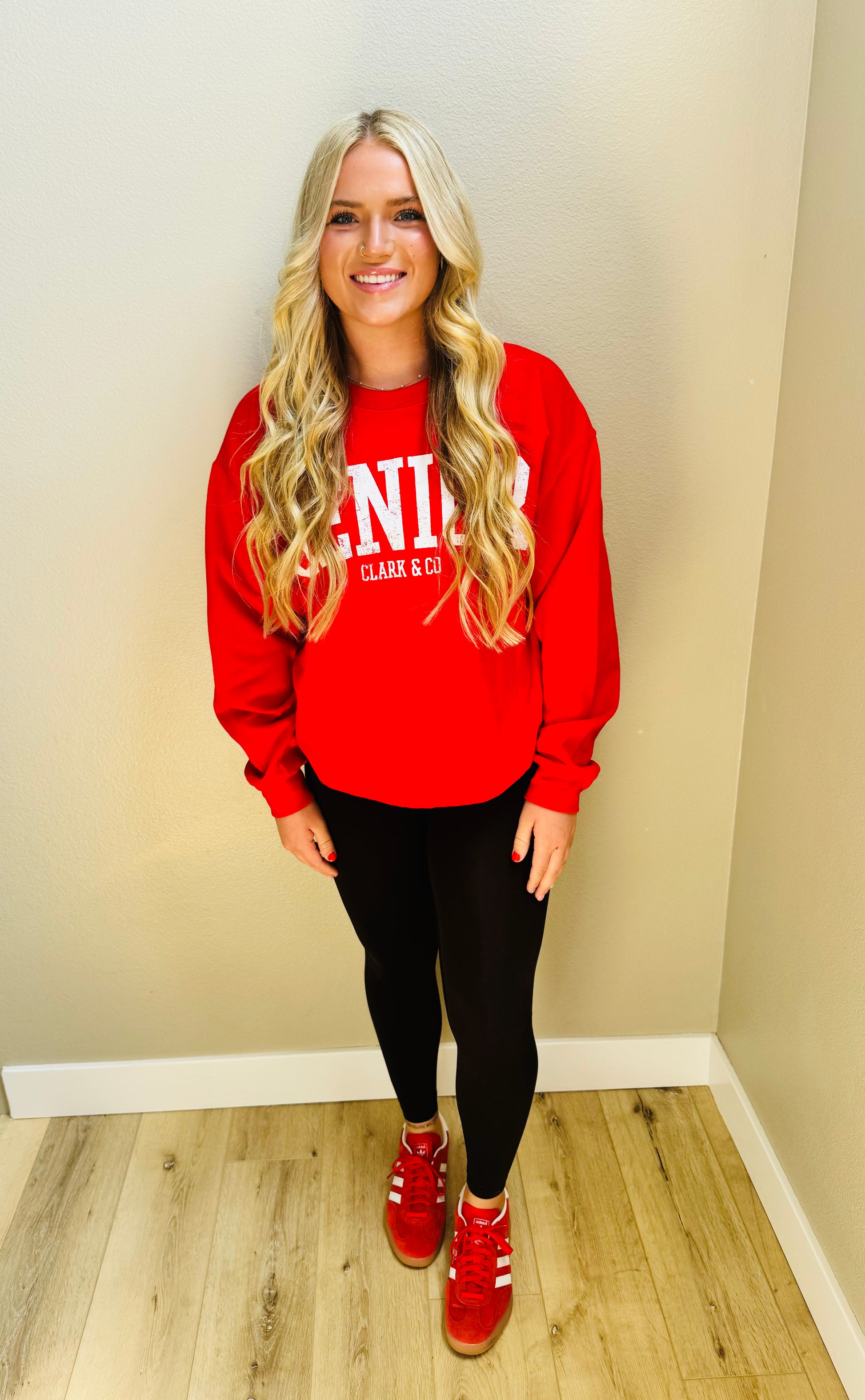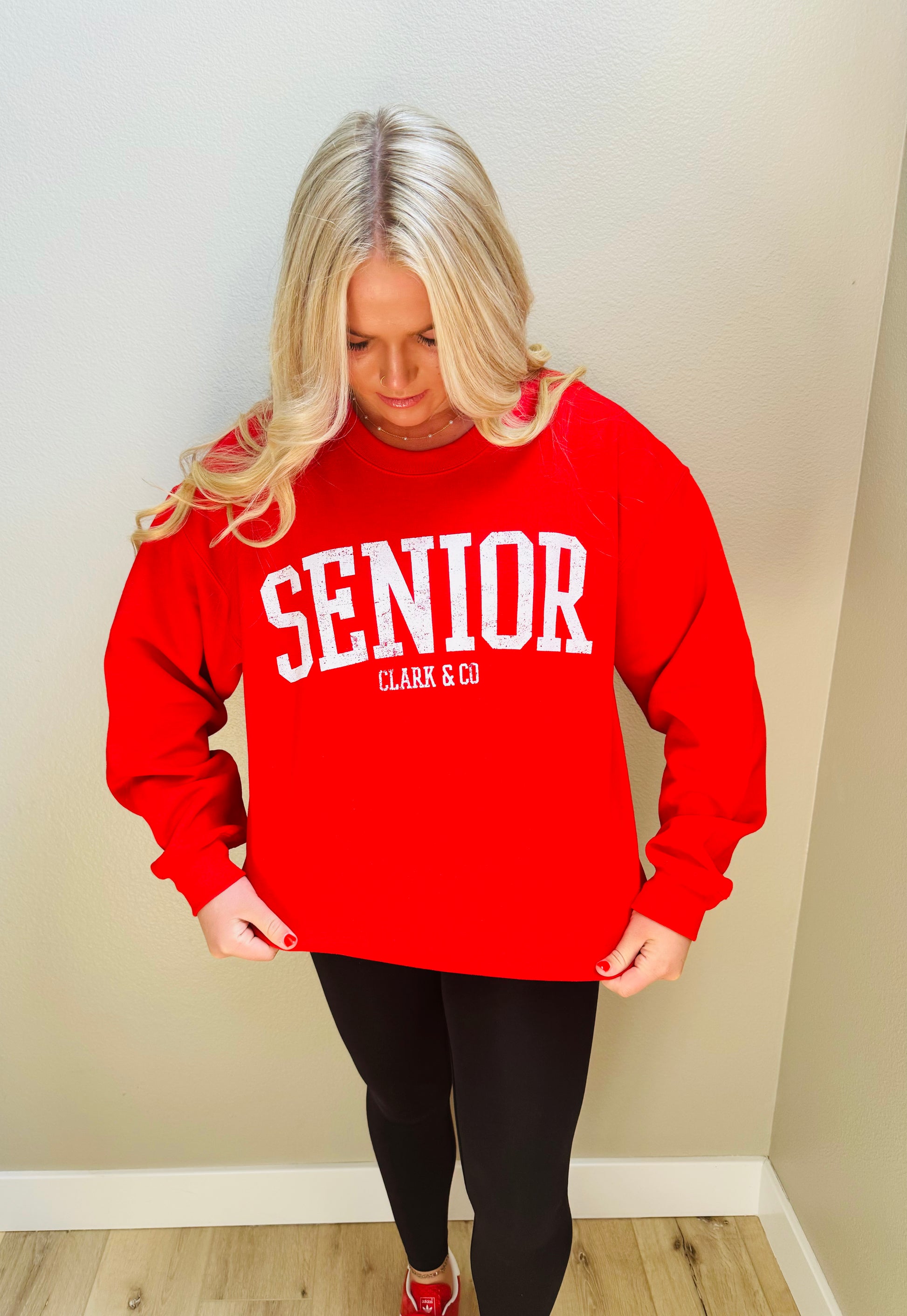 Custom SENIOR Clark & Co sweatshirt. Classic unisex fit. So for girls that want a more fitted size one down. Color is red. Model is wearing a size medium