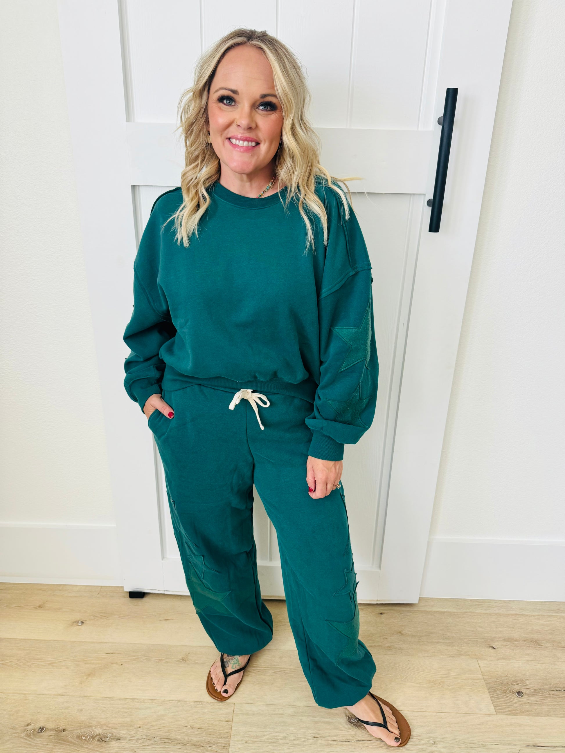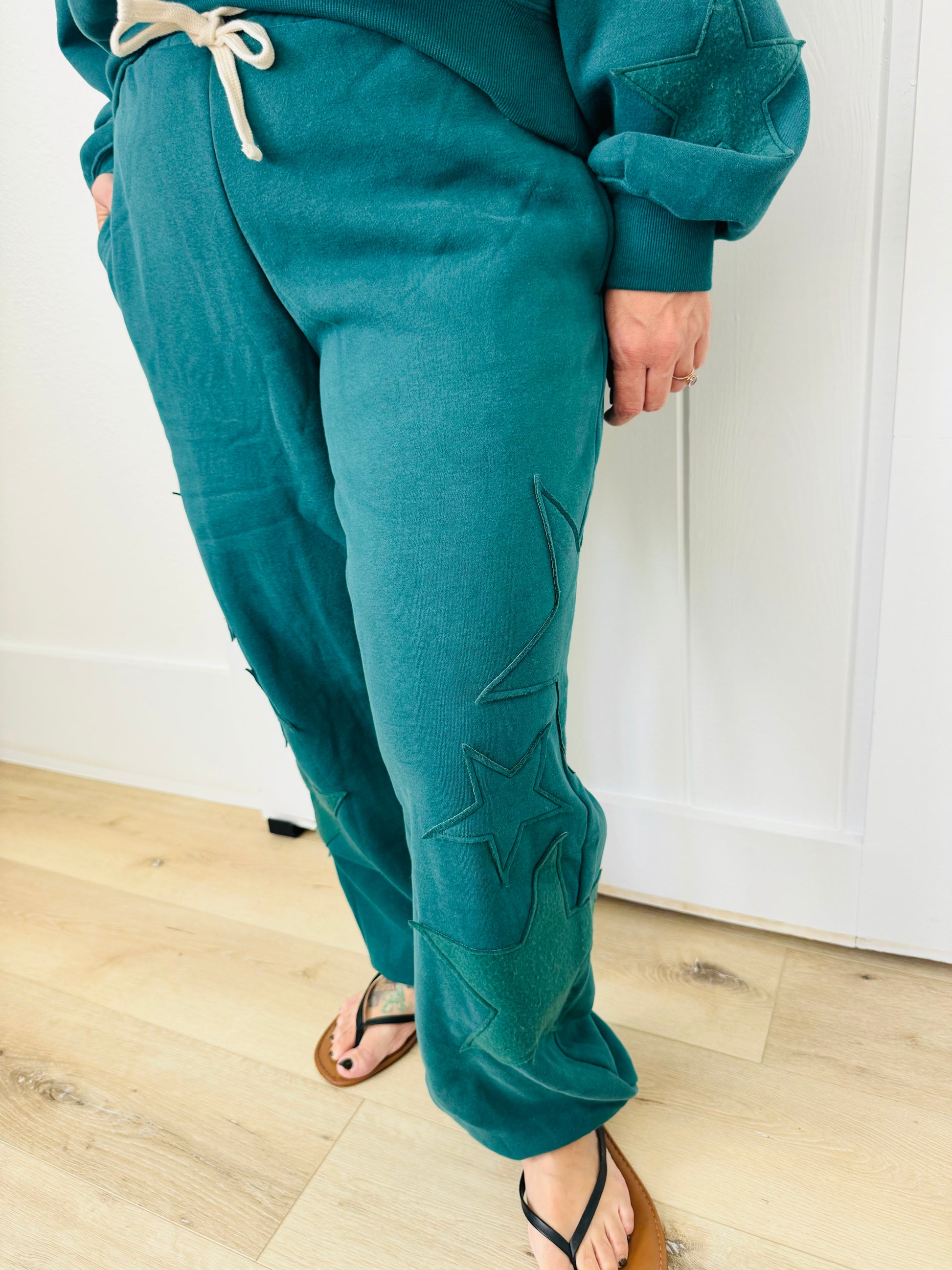Made Of Soft Fabric, These Relaxed-Fit Sweatpants Feature An Adjustable Waist Drawstring For A Comfortable Fit. The Unique Star Patch Detail Adds A Playful Vibe, Making Them Versatile For A Variety Of Occasions. Perfect For A Leisurely Weekend, Pair Them With A Cozy Sweater And Sneakers For A Comfortable And Stylish Look. Available In A Variety Of Colors. Color is hunter green. Model is wearing a size small. Check out the matching sweatshirt!