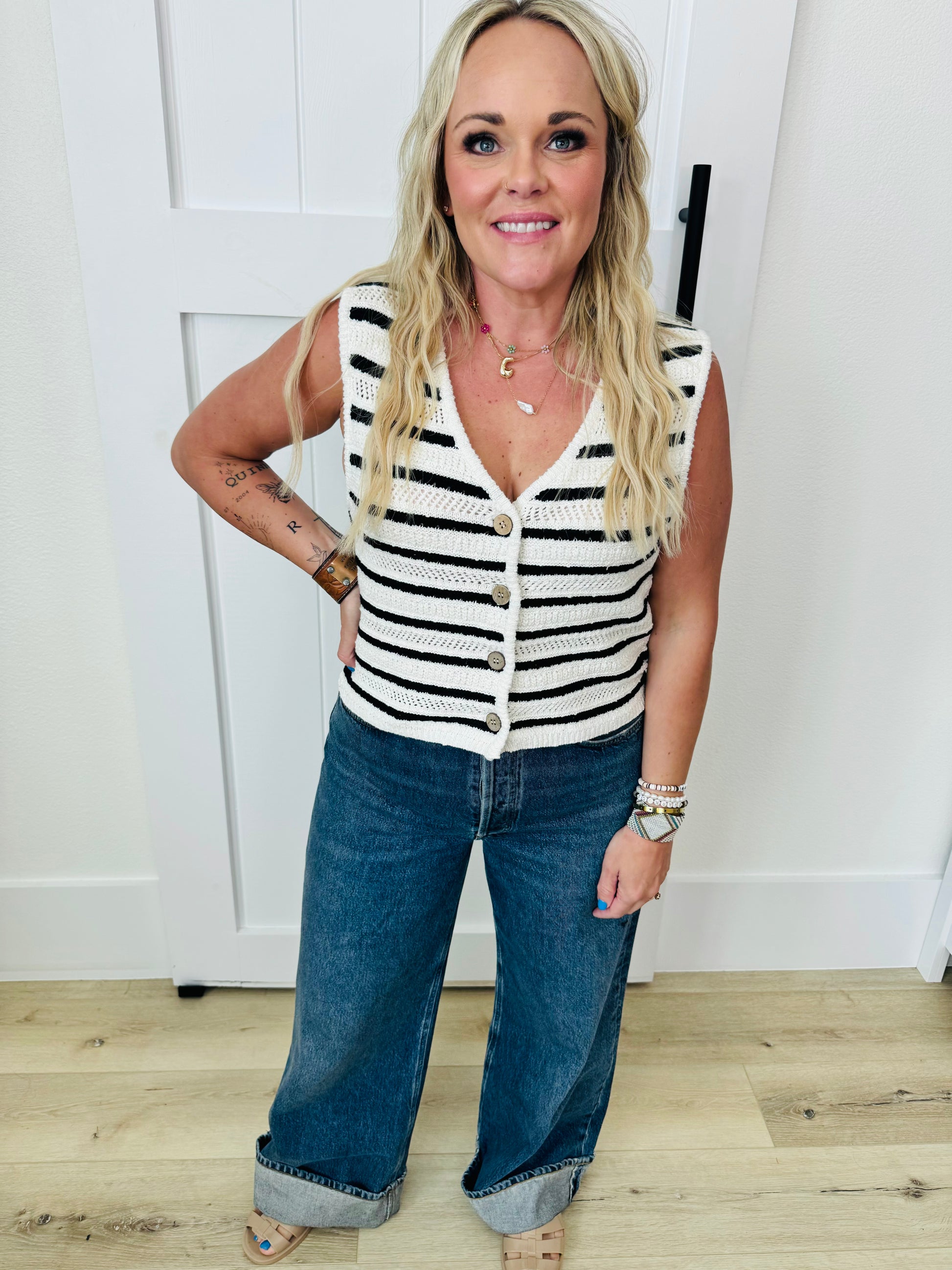 This Trendy Vest Will Always Get You Compliments. Featuring A Striped Pattern, This Top Has A V-Neckline That Leads To Wood Button Detailing. The Top Shapes A Sleeveless Cut Bodice With A Fitted Silhouette. Color is black and white stripes. Model is wearing a size medium.