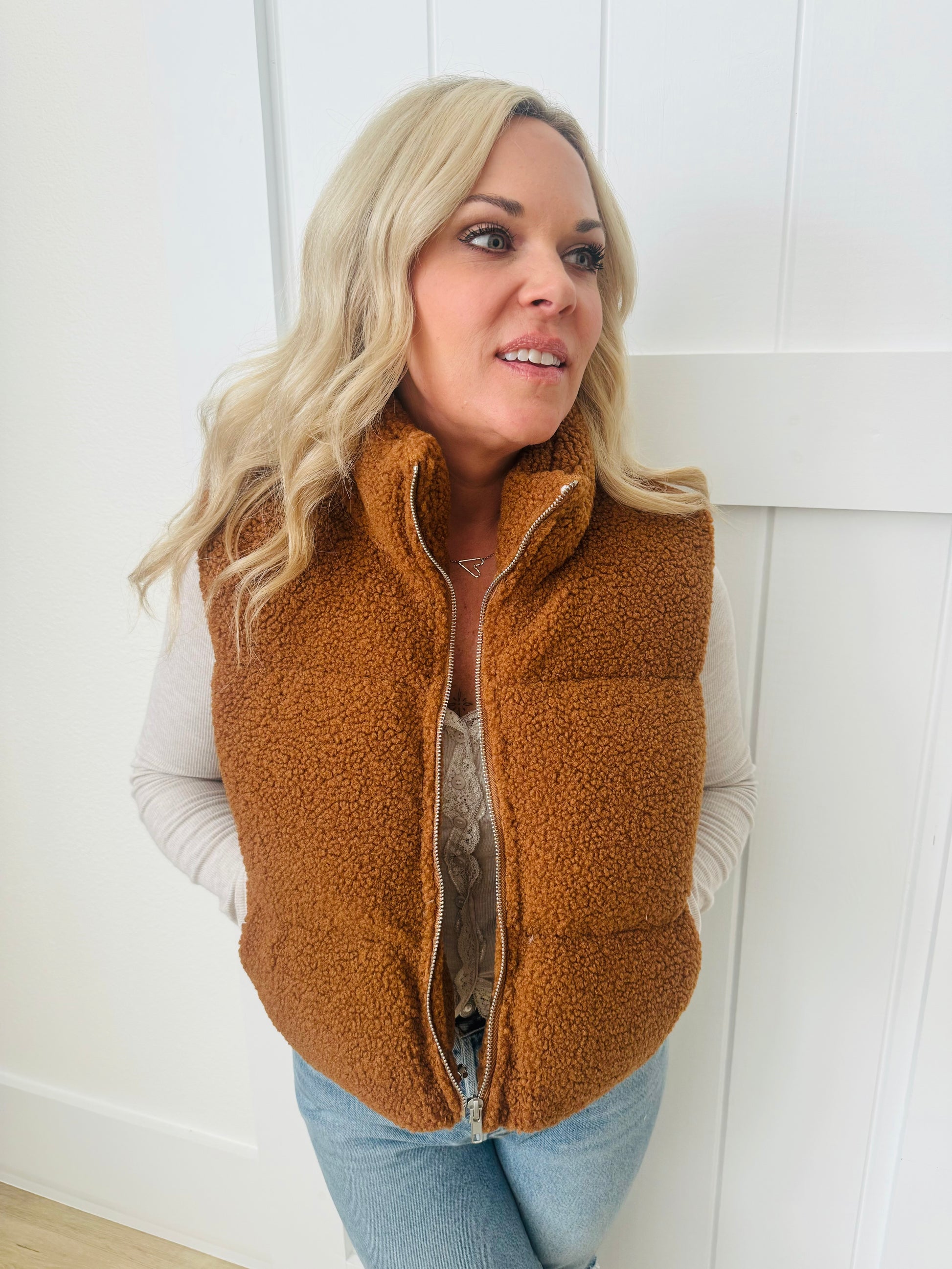 You and this vest go together like cold days and hot cocoa! Made from warm teddy fabric with padding that offers adequate warmth, it is designed with a stand collar and a perfect open front zip. Convenient side pockets are also added. Color is brown. Model is in a size large.