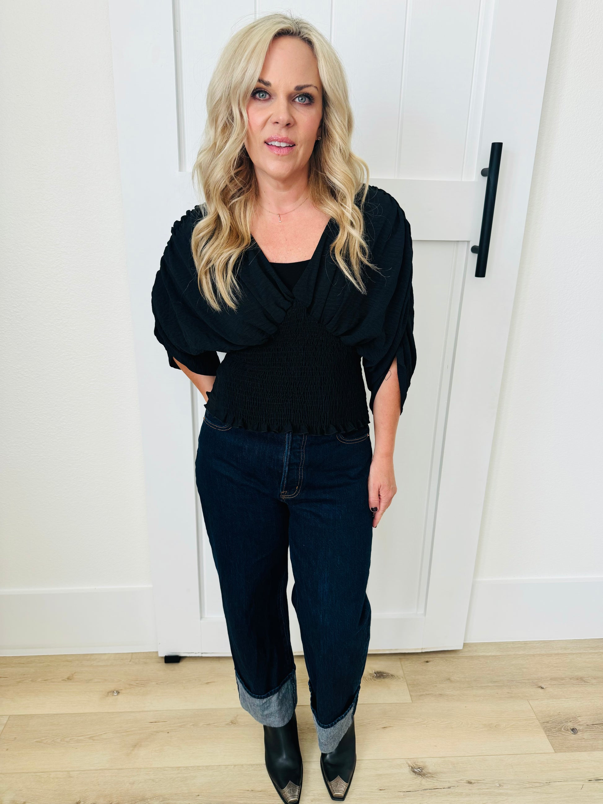 Effortlessly elegant, this solid blouse features a ruched V-neck and relaxed dolman sleeves, making it a versatile piece for both work and weekend outings. Color is black. Model is wearing a size medium