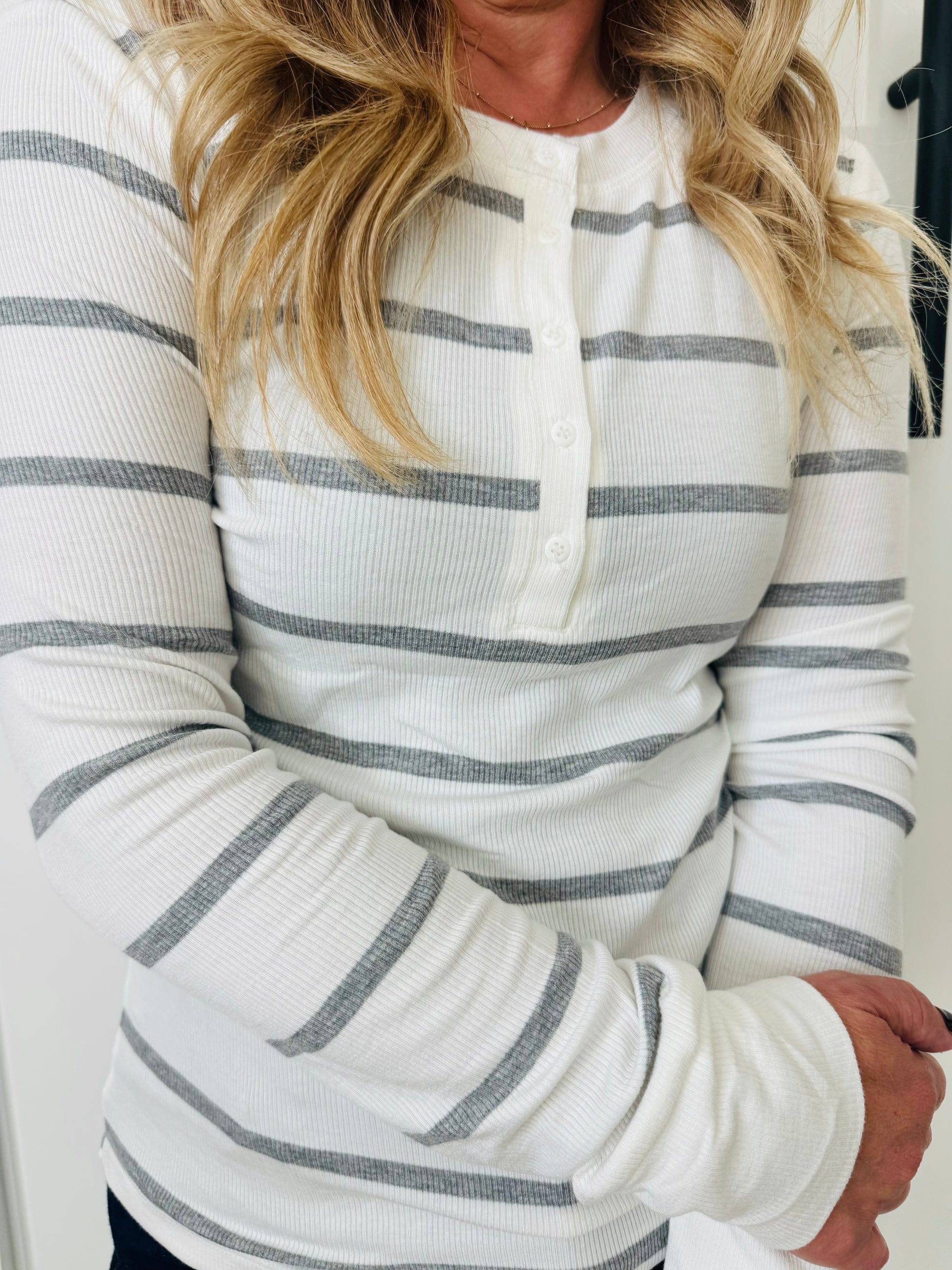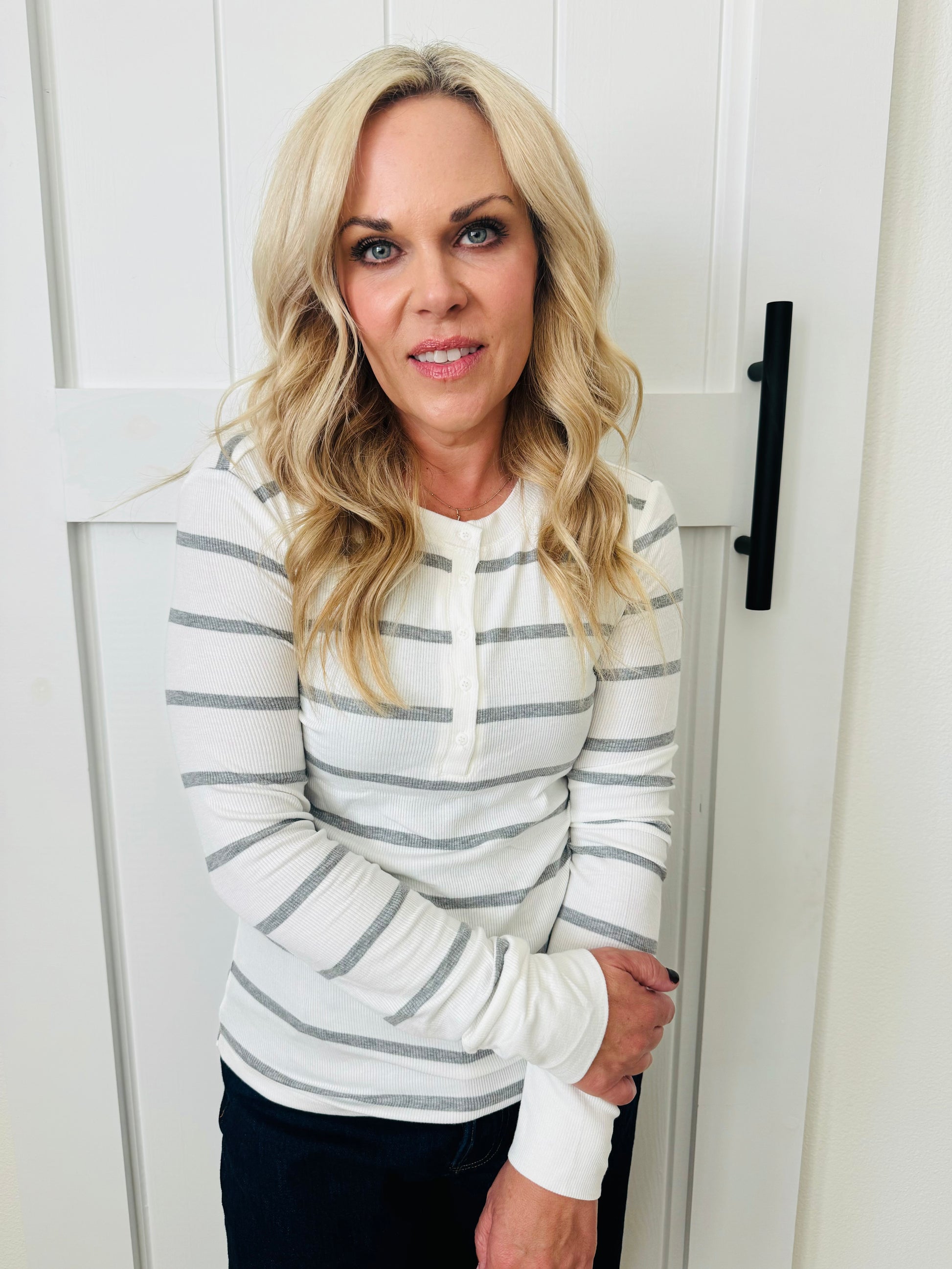 Ultra-soft and easy to wear, this striped long-sleeve henley is the perfect layering piece. A timeless essential you’ll reach for day after day. Color is grey and white. Model is wearing a size medium.