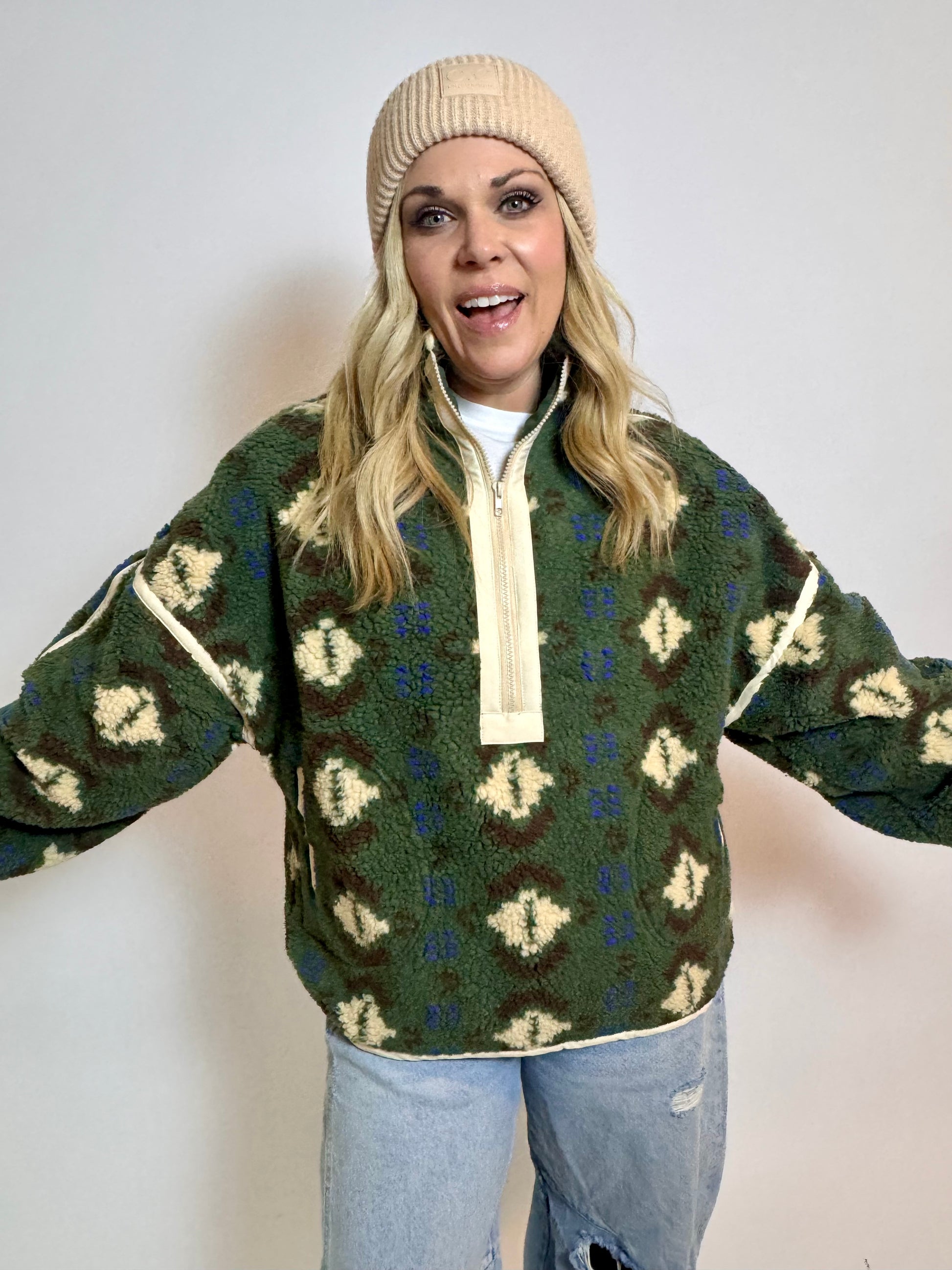 A geometric-print sherpa fleece pullover jacket with the following features: