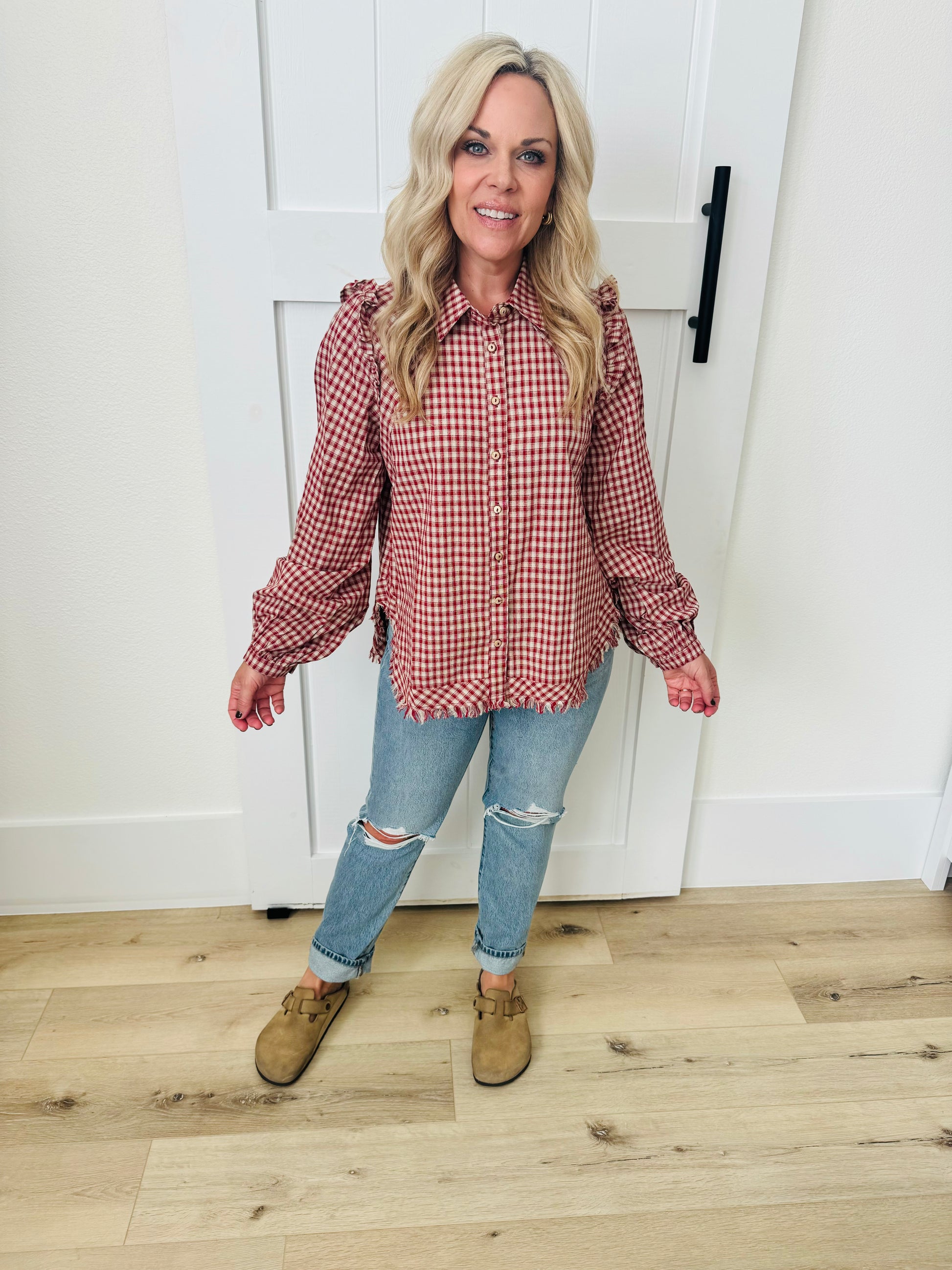 Plaid Button Down with raw edges, & ruffled shoulders. Color is red & tan gingham. Model is wearing a size medium.
