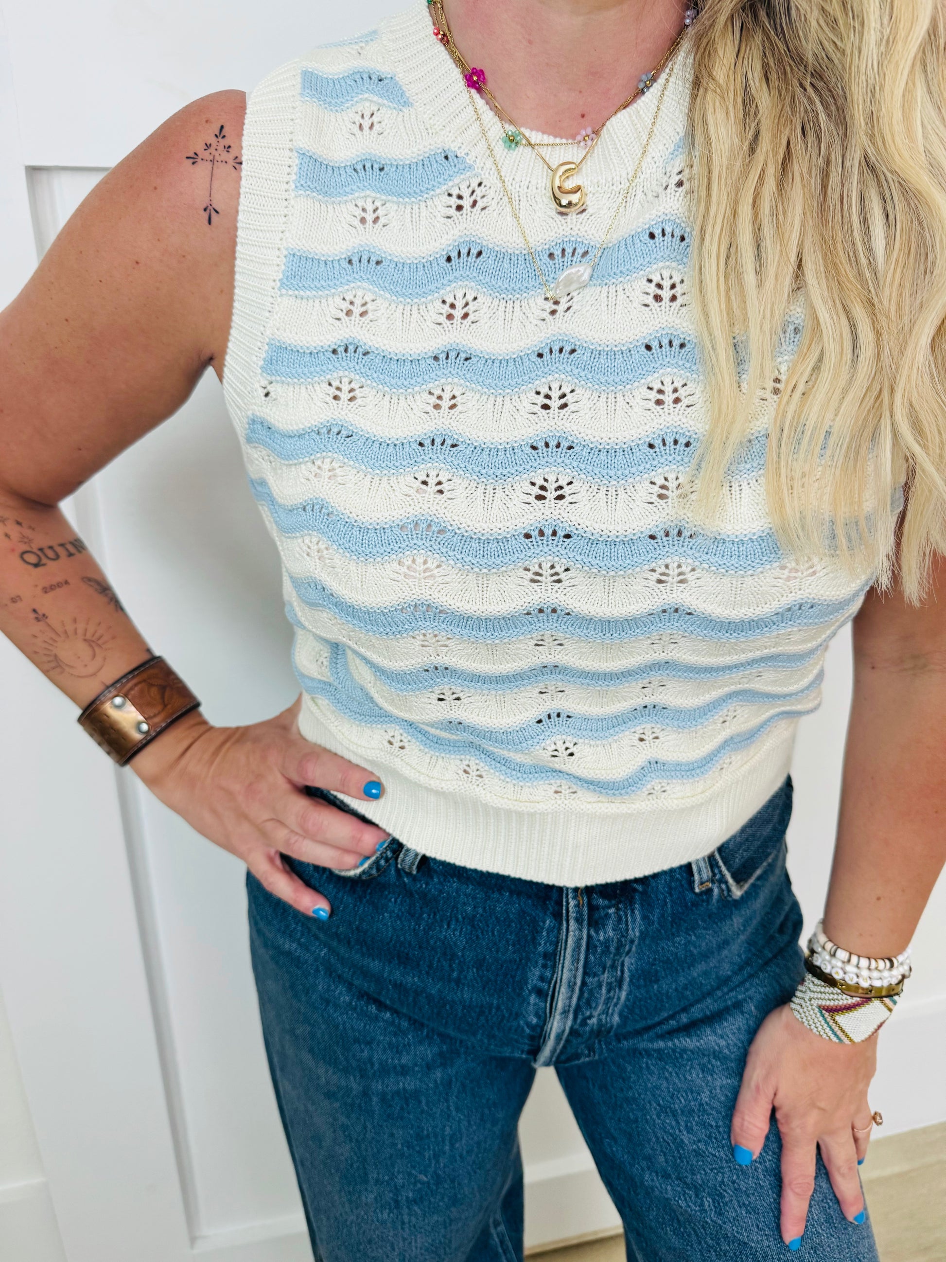 Crafted From Knit, This Top Has A Wavy Pattern And Forms A Sleeveless Bodice. Ribbed Detailing Is Featured Along The Neckline, Arm Holes And Hem. Color is blue/cream. Model is wearing a size large.