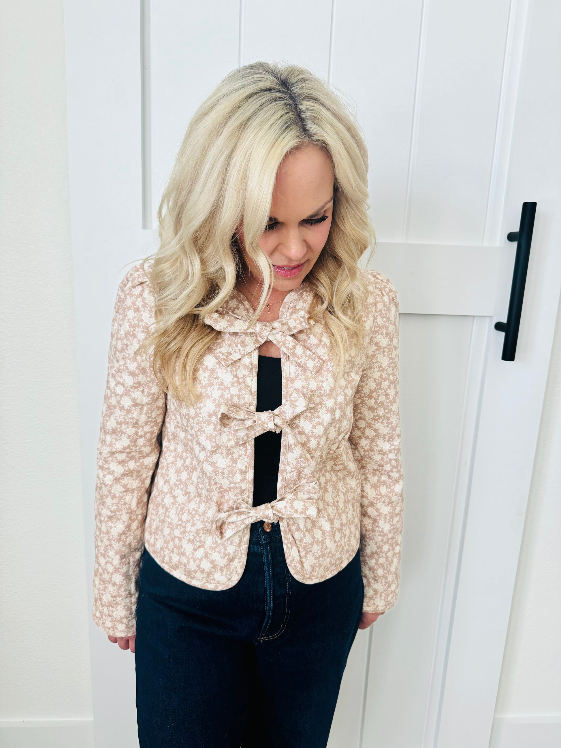 A breezy floral layer with a flattering fit, long sleeves, and double front ties. Perfect for tossing on over a tank or dress for an effortlessly feminine touch. Color is tan. Model is wearing a size medium.