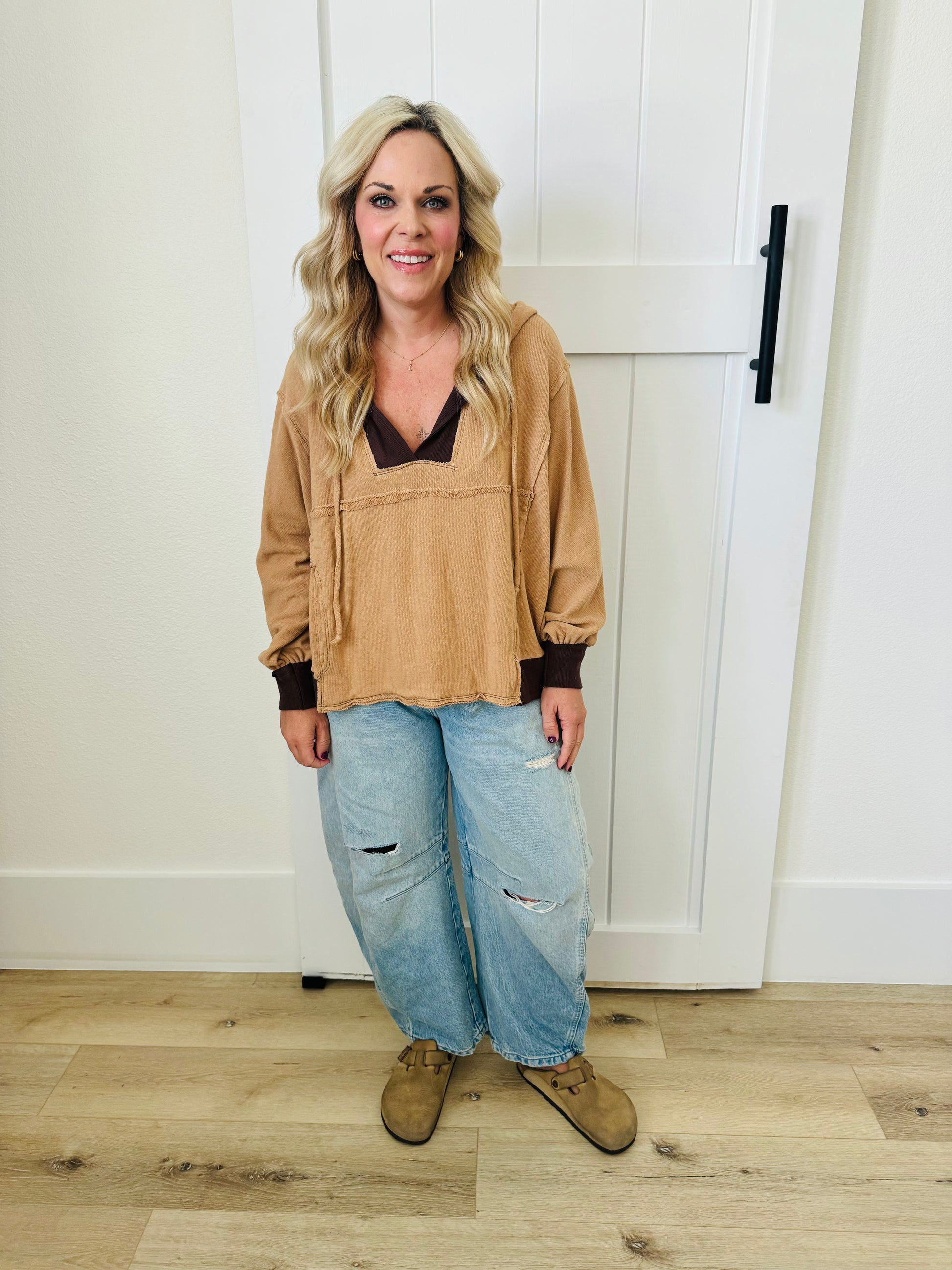 A lightweight, loose-fit hooded top featuring contrasting colors and raw-edge detailing for a relaxed, effortlessly stylish vibe—perfect for layering or lounging. Color is tan and brown. Model is wearing a size medium.