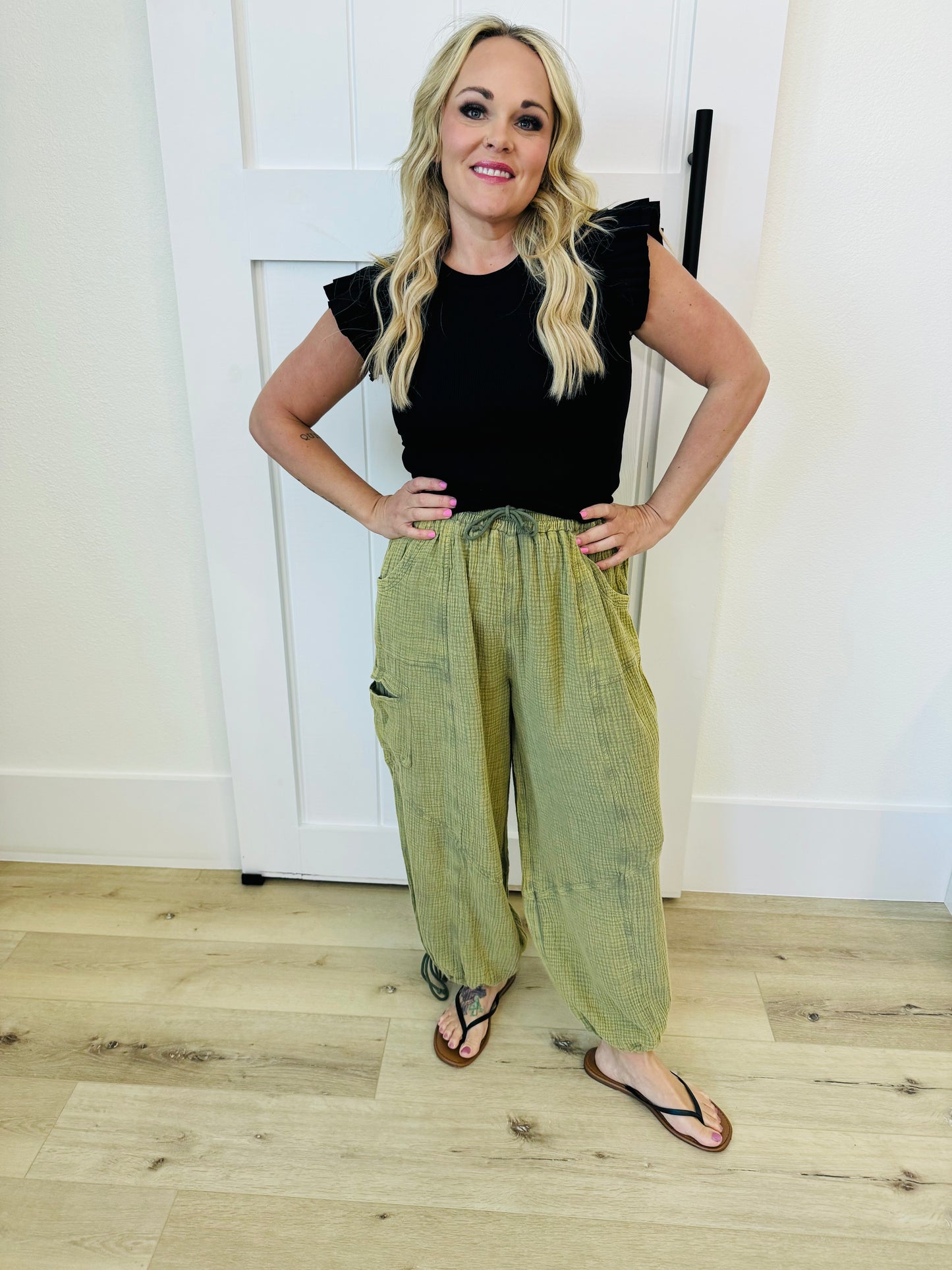 Effortlessly relaxed and endlessly versatile, the desert drift pants bring a perfect blend of comfort and style. Crafted from lightweight crinkle gauze with a mineral-washed finish, these harem-style pants offer a soft, lived-in feel with a touch of boho charm. The loose, flowy silhouette and elastic waistband make them ideal for all-day wear, whether you're lounging, exploring, or dressing them up! Color is washed olive. Model is wearing a size medium.