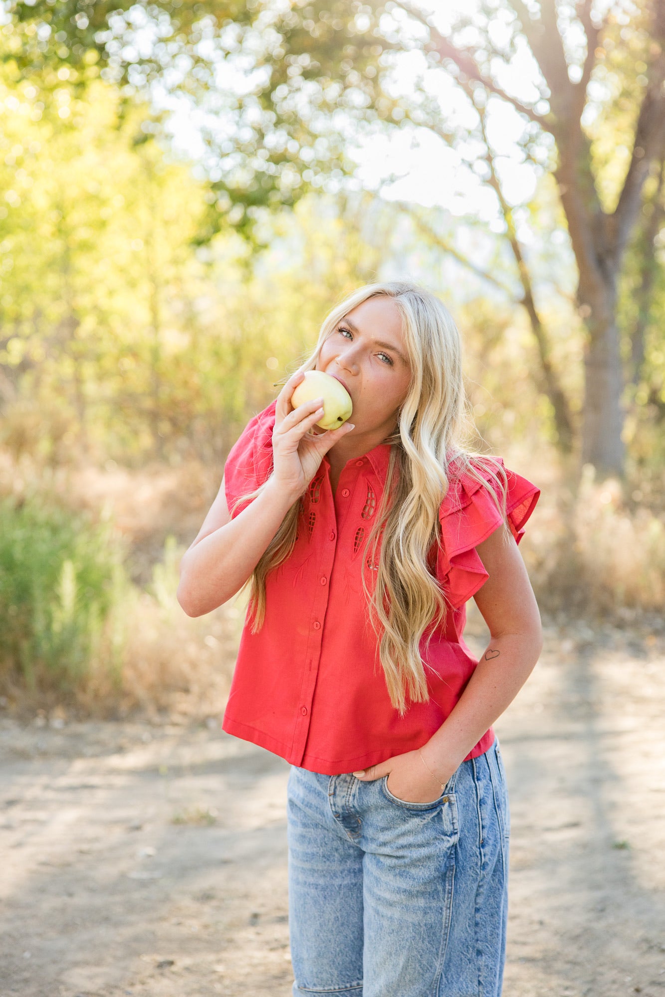 Embroidered Cut Out Button Down Top. With ruffle sleeves. Color is red. Model is wearing a size medium, color is red.